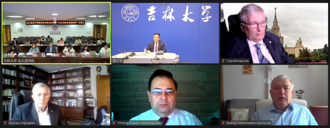 On September 15th , Learning from History and Progress with Society, a sub-forum of the 2021 International Conference on Cooperation in Industry, Academia, Research and Application(Changchun), was held at Jilin University, Humanities and Social Sciences Key Research Base of Ministry of Education, co-organized by the Northeast Asian Research Center of Jilin University, Northeast Asian Studies College of Jilin University, and Jilin University-Moscow State University History Research Center. Professor Cai Lidong, Vice President of Jilin University, Professor Wu Hao, Director of Northeast Asian Studies College and a professor of Kuang Yaming Distinguished Professor of Jilin University, Professor Zhang Guangxiang, Director of the Jilin University-Moscow State University History Research Center and a professor of Kuang Yaming Distinguished Professor of Jilin University, Academician С.P. Karpov, member of the Russian Academy of Sciences, Chairman of the Council of Heads of History Departments of Russian Universities, former Dean of Faculty of History, Moscow State University, Meritorious Professor, Honorary Professor of Jilin University, Academician Л.I. Borodkin, Corresponding Member of the Russian Academy of Sciences, Deputy Head of Faculty of History, Moscow State University, Honorary Professor of Jilin University, Professor С.V. Mironenko, Corresponding Member of the Russian Academy of Sciences, Russian State Archives Director, Professor Ю.A. Petrov, Director of the Institute of Russian History, Russian Academy of Sciences attended the forum. The opening ceremony of the forum was hosted by Professor Wu Hao.