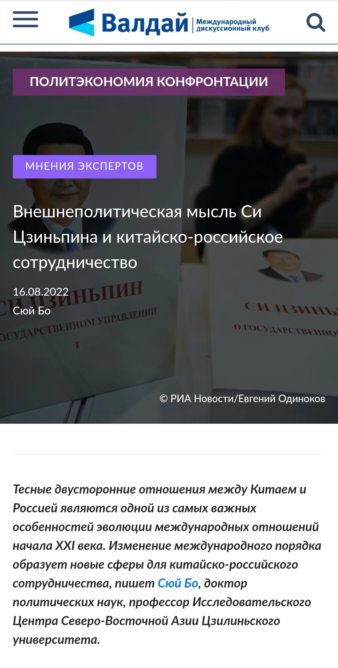 Professor Xu Bo Has His Article on Xi Jinping’s Foreign Policy Thinking Published on the Official Website of “Valdai Club”, a Russian think tank