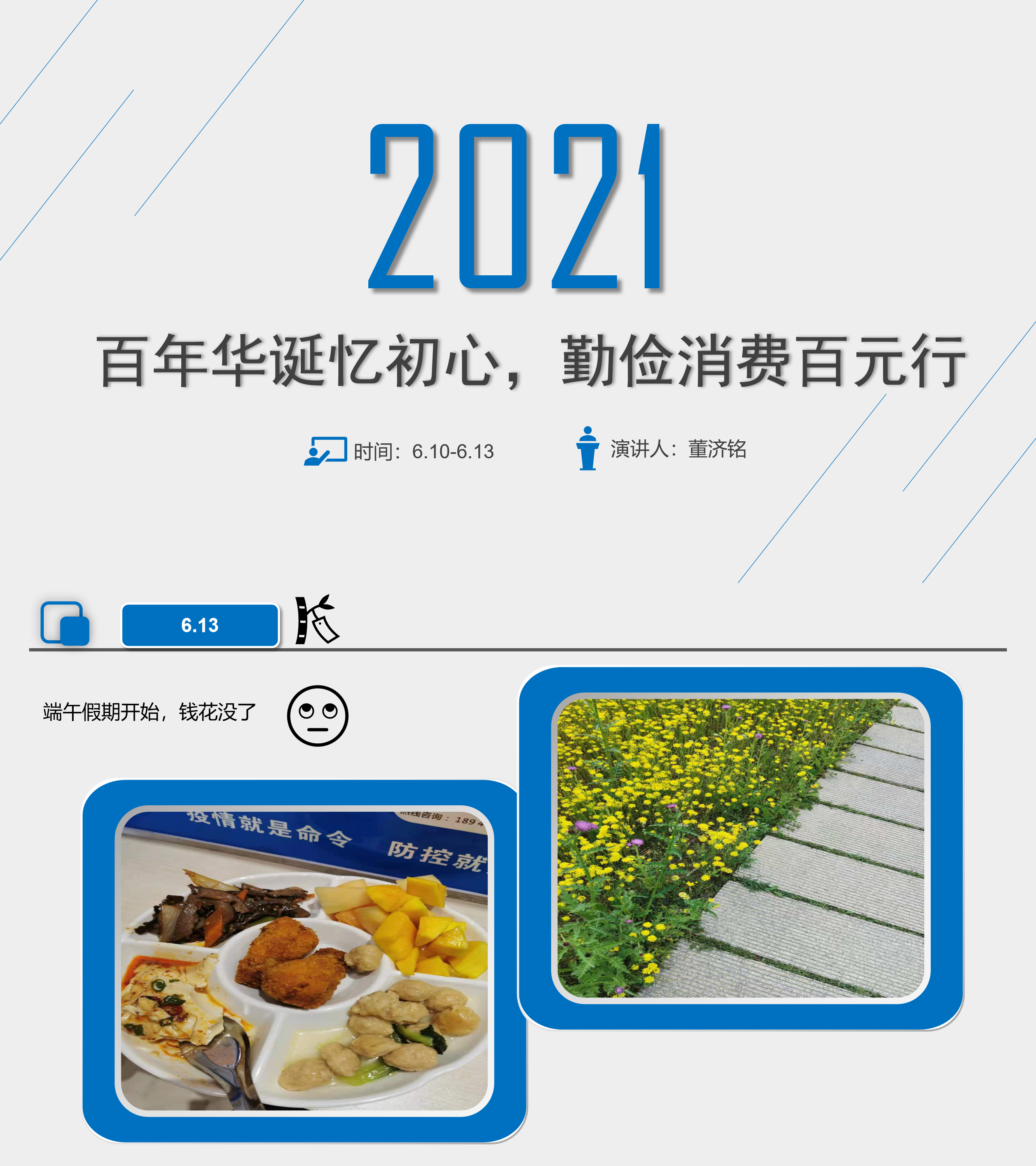 本次活动规则为2021年6月8日至6月15日,选择任意连续4天用100元进行 h动漫 校园生活,并且尽可能地丰富多彩,可涉及到饮食、交通、学习、运动、娱乐等多方面;实际消费情况采取图片或者视频等方式进行记录最终做成PPT或vlog等形式进行展示。通过评选确定了6名同学的作品获奖。