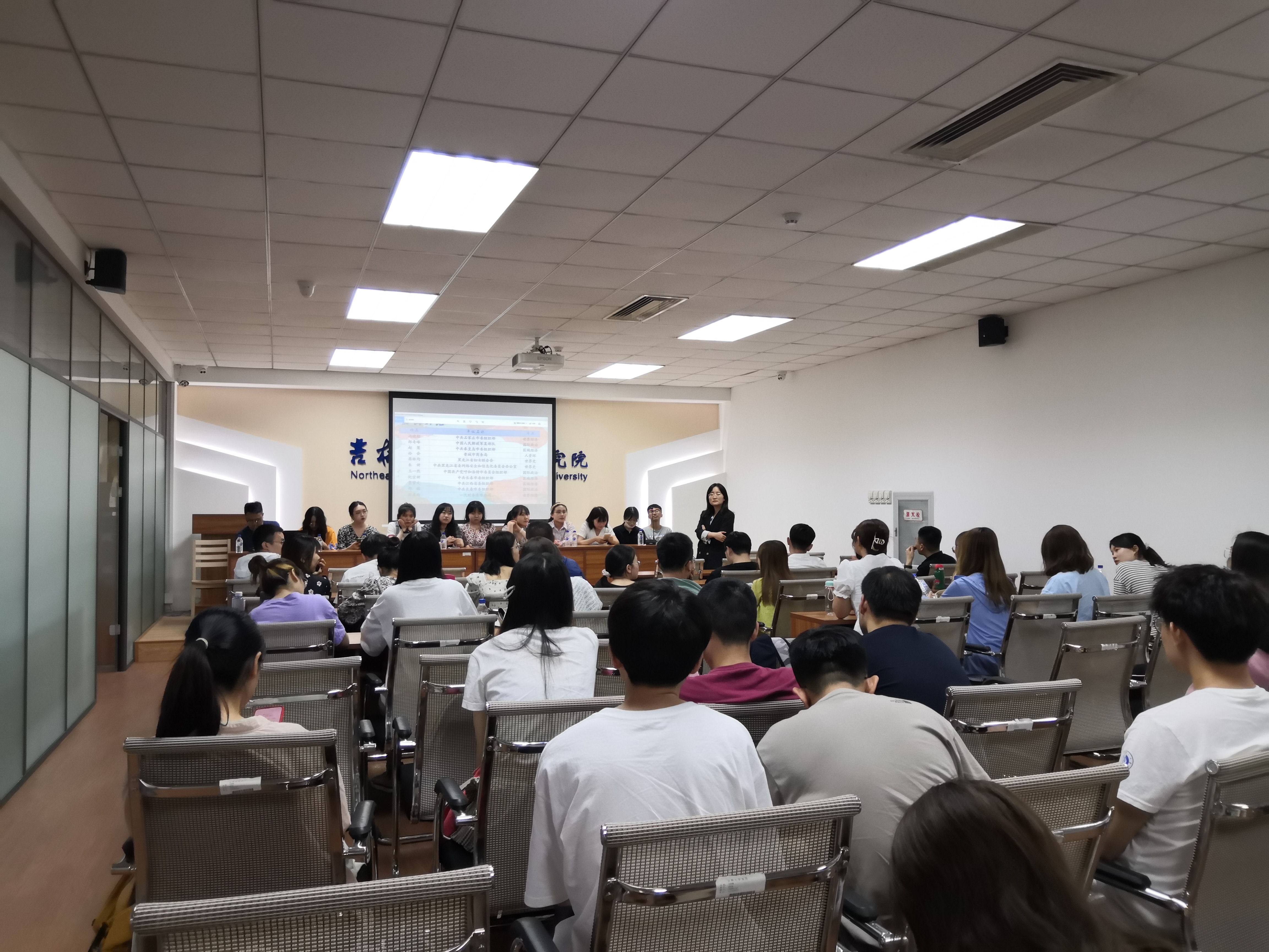 副书记兼副院长赵毅博老师主持,研究生辅导员山丹老师和2021届毕业生代表、2022届毕业生共70余人参会。