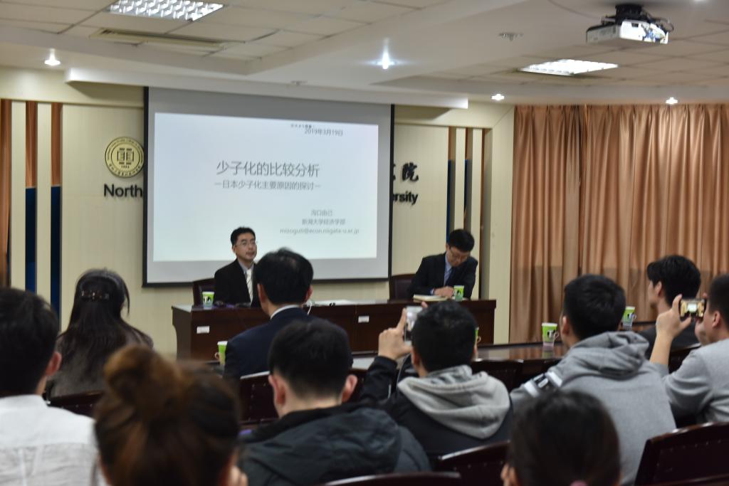 319日下午,新潟大学经济学部沟口由己副教授和法学部稻吉晃副教授分别以“少子化的比较分析”、“港口城市新潟——期待对岸贸易的历史”为题做了学术报告。沟口教授在报告中,结合具体数据对二战后,尤其20世纪70年代以来的少子化现象进行了分析,从生育的直接成本和间接成本解释了出现少子化现象的原因,提出导致日本少子化问题不断加剧的主要原因在于影响育龄妇女实现生育与工作并立的雇佣制度,并就此对比分析了中国的少子化问题。稻吉晃副教授在报告中回顾了新潟作为一个港口城市的发展历程,分析了新潟在不同历史阶段的发展思路,指出随着日本经济发展模式的转变和经济重心的转移,新潟作为日本海一侧港口城市的区域优势不断减少,自主发展能力下降,最终走上了依赖于中央政府的发展道路。东北亚研究院的部分教师和研究生共50余人聆听报告,并就报告内容积极提出问题与报告人交流讨论,现场气氛特烈。