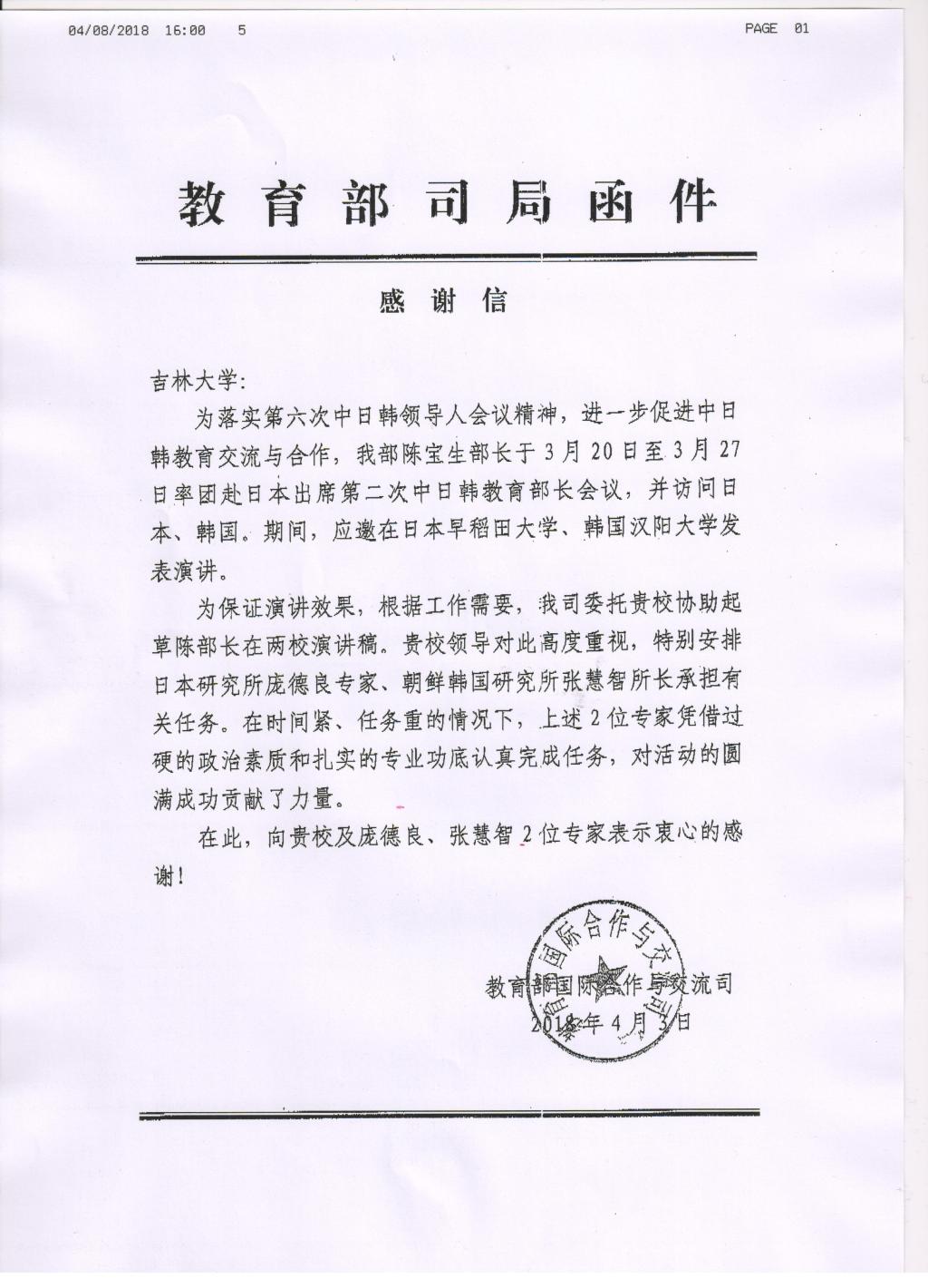 2018年3月20日至27日,教育部陈宝生部长应邀访问日本和韩国。期间,应邀在早稻田大学和韩国汉阳大学发表演讲。为保证演讲效果,受教育部委托, h动漫 安排东北亚研究院日本研究所所长庞德良教授和朝鲜韩国研究所所长张慧智教授协助起草在陈宝生部长在两校的演讲稿。庞德良教授和张慧智教授凭借过硬的政治素质和扎实的专业功底出色地完成了任务,对活动的圆满成功贡献了力量,教育部特此发函表示感谢。
