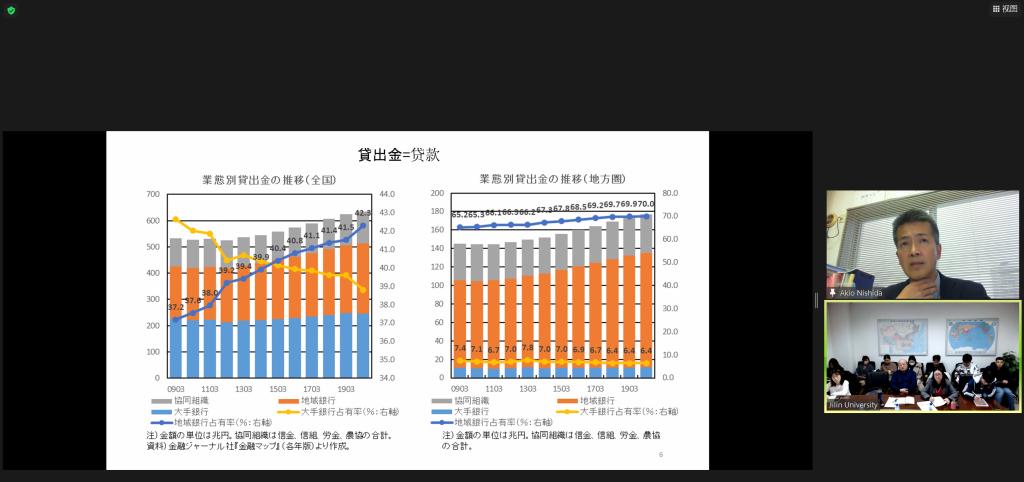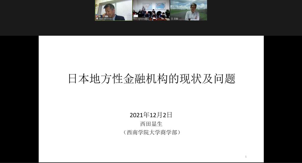 2021年12月2日,应 h动漫 东北亚研究中心、 h动漫 、东北亚研究院、 h动漫 日本研究所的邀请,日本西南学院大学商学部学部长西田显生(NISHIDA AKIO)教授做了以“日本地方性金融机构的现状及问题”为主题的学术报告。本次报告采取了线上和线下相结合的方式,由 h动漫 副院长崔健教授主持并致辞,世界经济研究所副所长李红梅副教授担任现场翻译, h动漫 的部分教师、博士研究生和硕士研究生参与了活动。