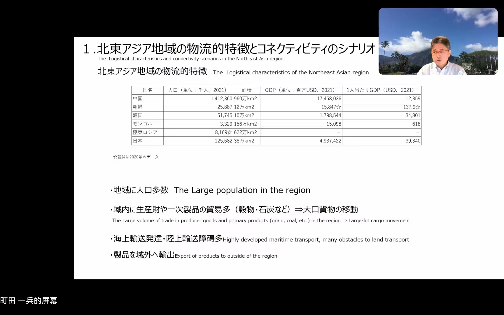 町田一兵教授从交通的视角去审视东北亚地区互联互通的建立,讲座分为六部分,第一部分为东北亚地区物流的特点;第二部分探讨了朝鲜半岛共建物流枢纽的可能性;第三部分分析了俄罗斯远东地区与蒙古在东北亚地区物流中的地位;第四部分介绍了日本在东北亚地区物流中的作用;第五部分评估了北极航线开通的可能性;第六部分讨论了中国东北地区在东北亚地区物流中所扮演的角色。
