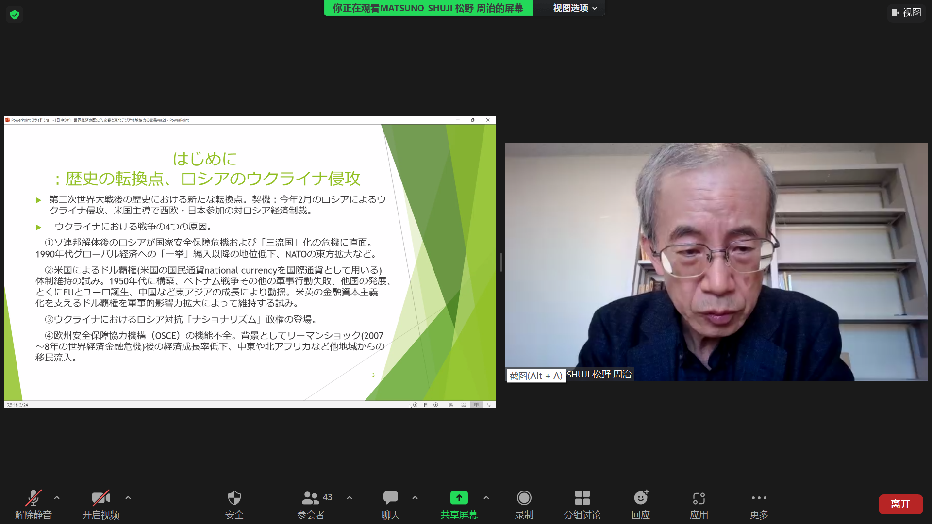 讲座内容分为三部分,松野周治教授首先回顾了中日建交50周年的合作交流历史,随后分析了中日两国未来合作所面临的挑战,最后提出了在世界经济格局深刻变化下中日合作是极其重要的观点。
