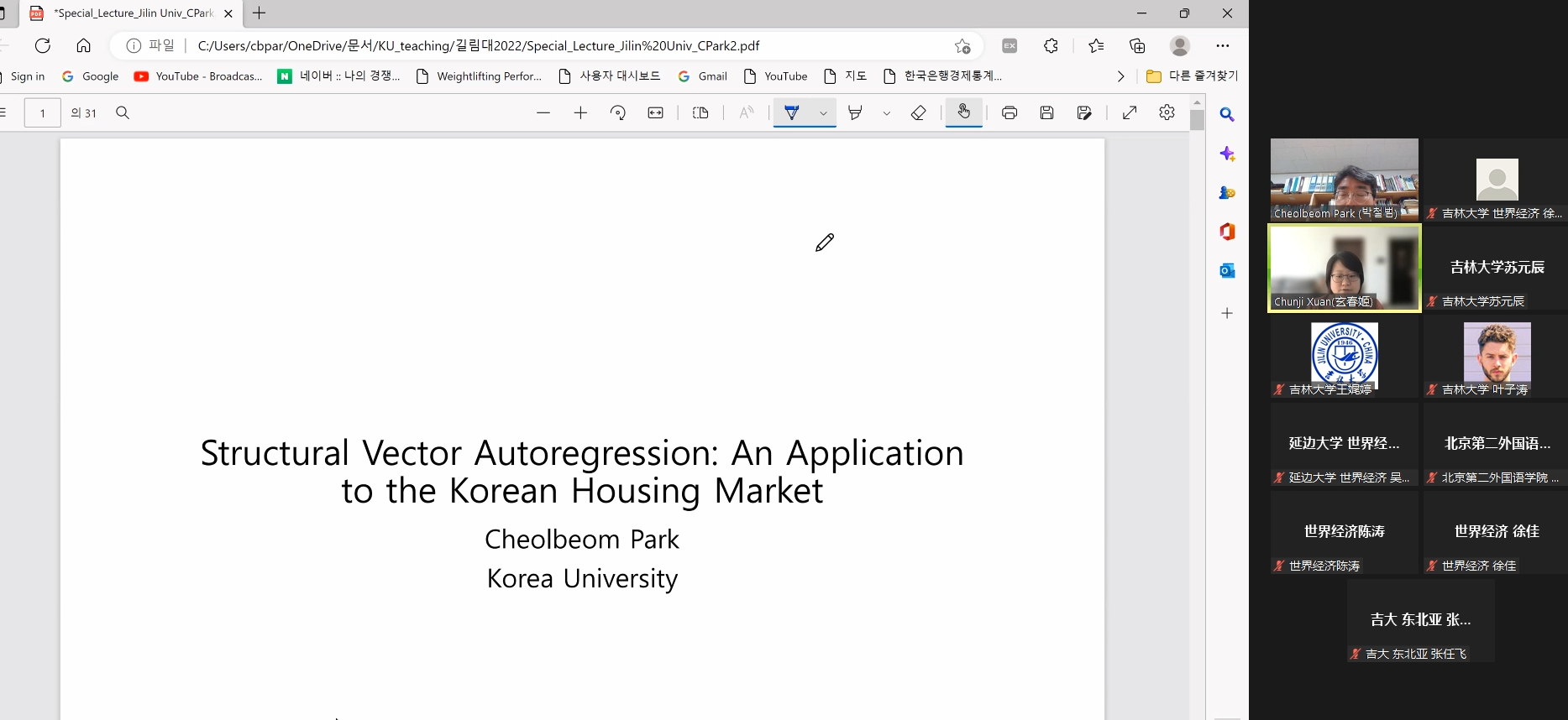 2022年12月9日,“东北亚国别与区域研究高端讲坛”之“结构向量自回归—对韩国房地产市场的应用”在 h动漫 顺利举行。本次讲座由 h动漫 东北亚研究中心、 h动漫 、东北亚研究院、国际文化交流学术联盟东北亚区域研究专门委员会联合举办。 h动漫 邀请到了韩国高丽大学经济系教授——朴哲范(Park Cheol Beom)教授来进行讲座。讲座由 h动漫 副教授玄春姬主持。