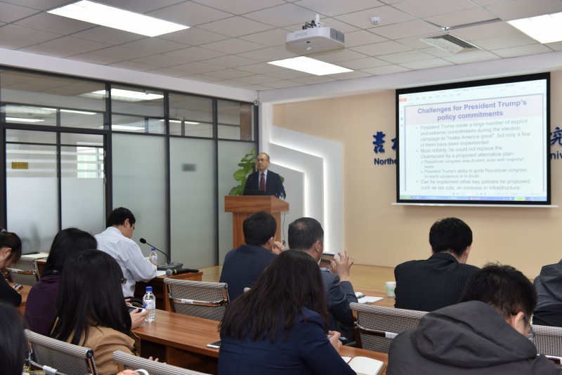 河合正弘教授在报告中首先谈到了特朗普政府上台后奉行的“美国优先”原则,认为在在经济全球化的今天,特朗普的上台为美国经济乃至全球经济增加了不安定的因素。接下来,河合正弘教授具体介绍了特朗普政府提出的宏观经济政策,并且指出宏观经济政策与贸易政策存在着矛盾之处,这些政策实施后会导致美国贸易保护主义提升、美国贸易交涉缓和等后果。最后,河合教授指出,面对特朗普政府上台后推行经济政策所产生的影响,本质上还要在于增强本国自身经济实力,中方更应该加大开放力度,服务市场应进一步开放,保持经济强劲势头。中日韩三国应在加强区域合作和的基础上不断推进,建立稳定的亚洲金融市场。