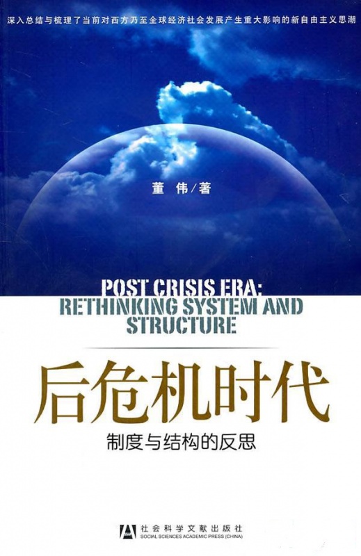 董伟教授所著专著《后危机时代——制度与结构的反思》是2011年5月由社会科学文献出版社出版,是从哲学、社会学、经济学的多学科视角出发,针对后危机时代凸显的社会矛盾以及日本核危机造成的全球恐慌问题,从反思、批判的角度,运用马克思主义基本原理,深入总结与梳理了当前对西方乃至全球经济社会发展产生重大影响的新自由主义思潮,对经济制度选择与社会结构关系的一系列理论问题进行了较深入、系统的分析,创新性地提出社会生产方式决定制度的选择、社会结构决定经济制度存在的形式和性质的理论观点。