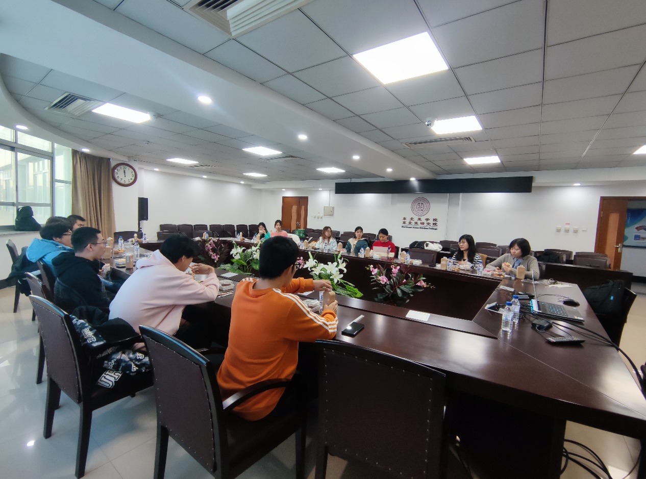 2021级本科生步入大三年级后学习生活各方面的反馈,使学生们对毕业后安排提前思考和规划,及时为同学们答疑解惑,学院于10月27日中午在东荣大厦404会议室举办了“东北院学院2021级师生午餐会”。学院经济系李天籽老师、赵杨老师,本科生辅导员贾琼老师以及2021级本科生代表参与了此次冷藏会。