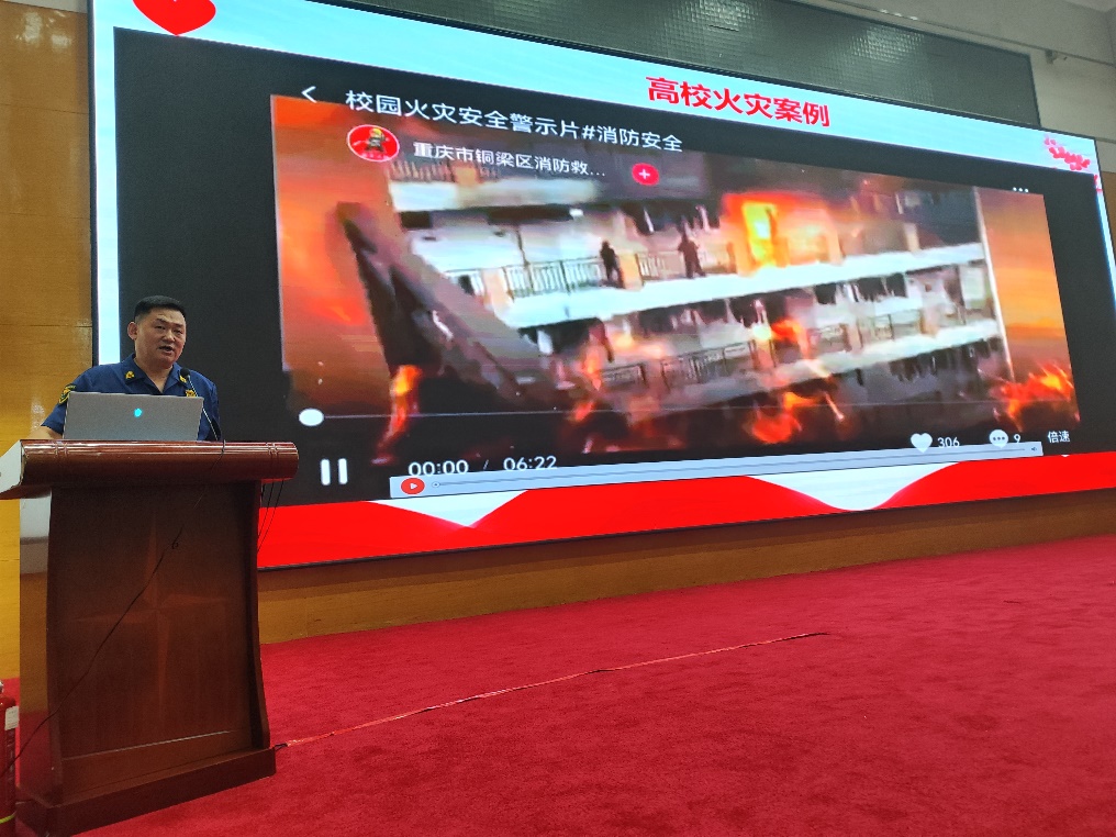 保卫处董立明老师为同学们讲解了因违规使用电器、实验室违规存放、缺乏灭火常识等引起的火灾事故案例,介绍了消防安全制度以及灭火器使用方法等等。